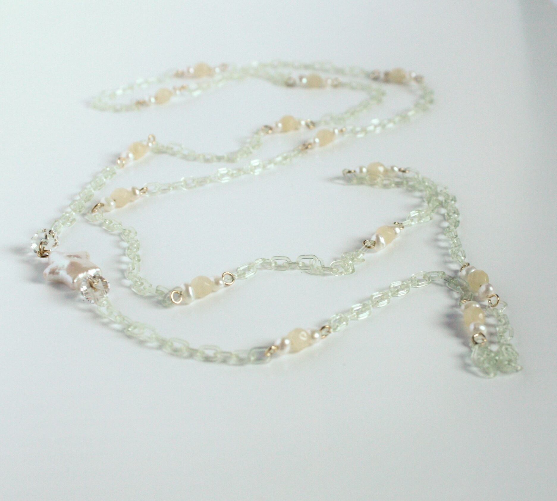 プラスチックチェーンロングネックレス 淡水パール(星) イエロージェイド(別売)とお揃いです。(5枚目の写真)
