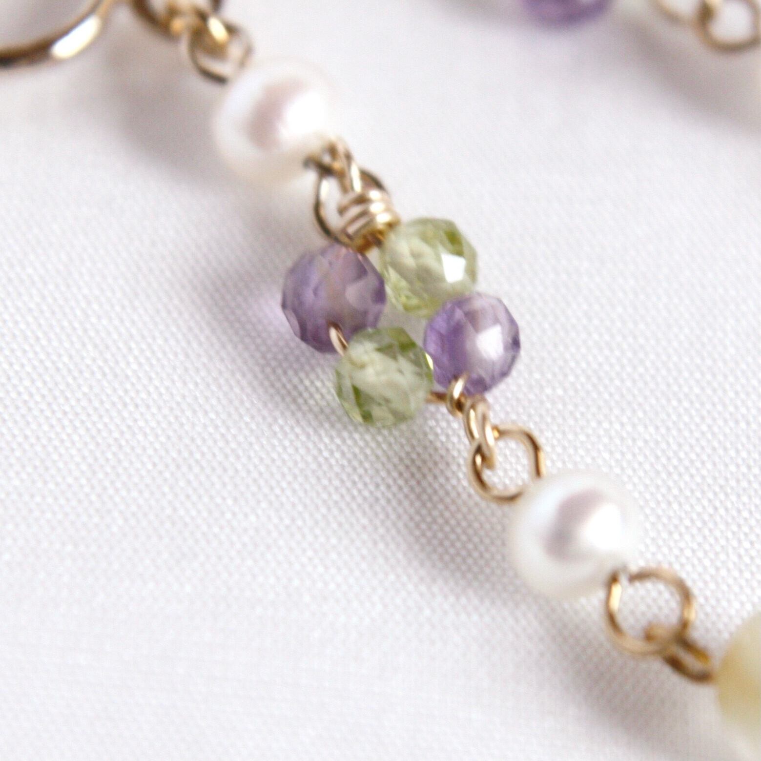 カットの入った小粒のアメジスト、ペリドットと合わせて、優しい色合いに。