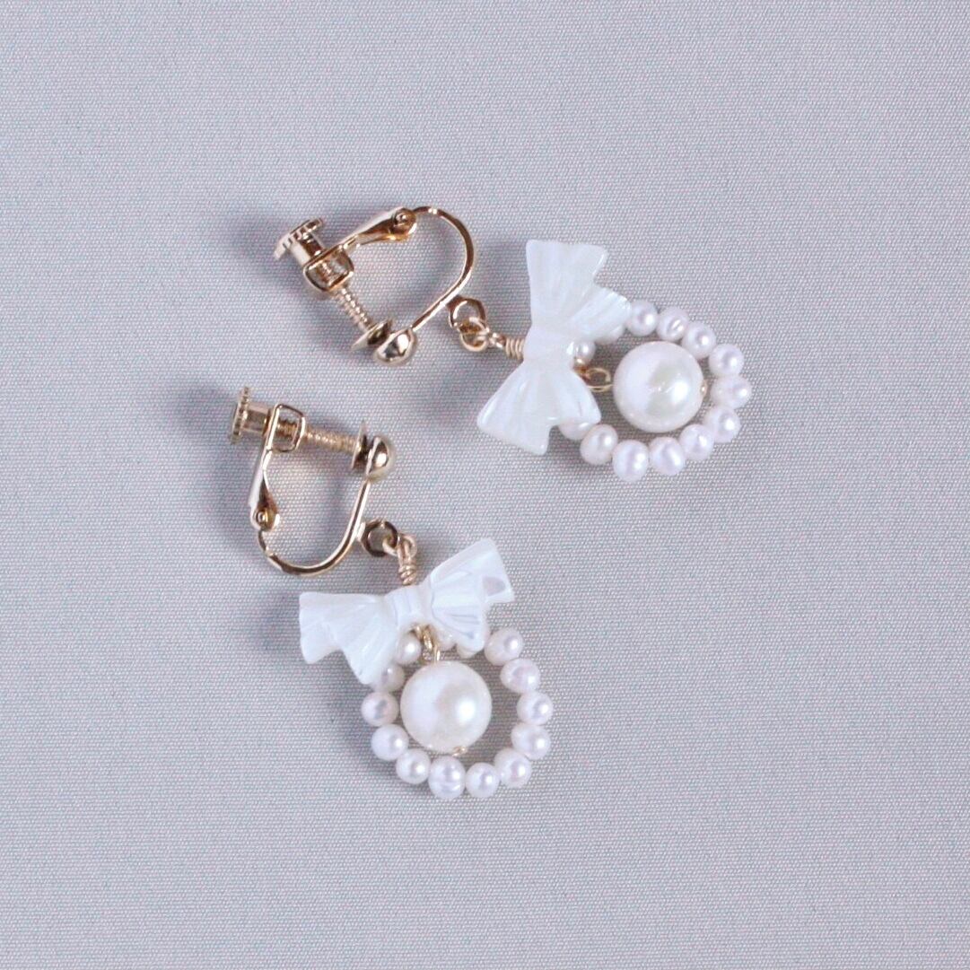 淡水パールのリースに、マザーオブパールのリボンを付けました。