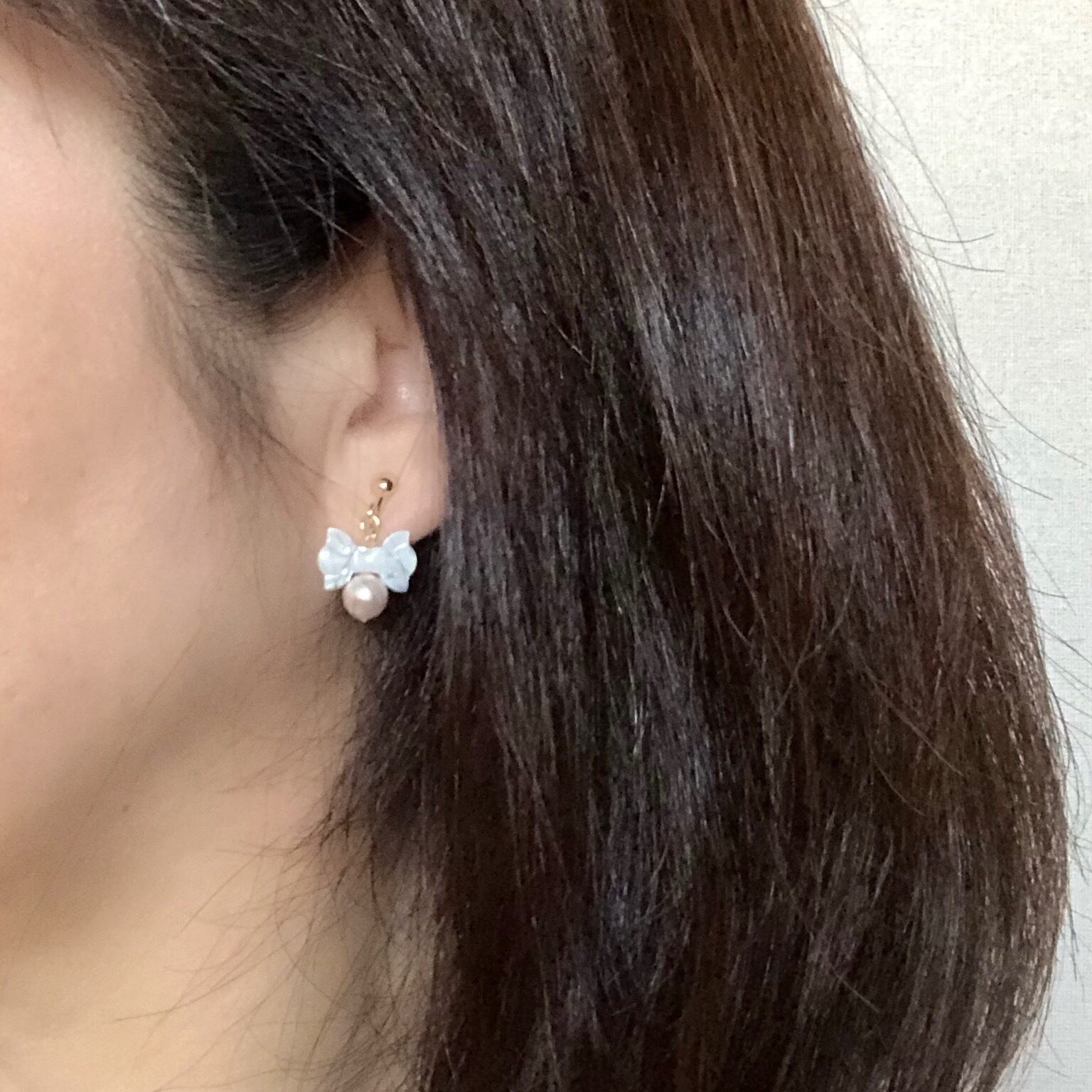 リボンシェイプのマザーオブパールとあこやパールのイヤリングです。