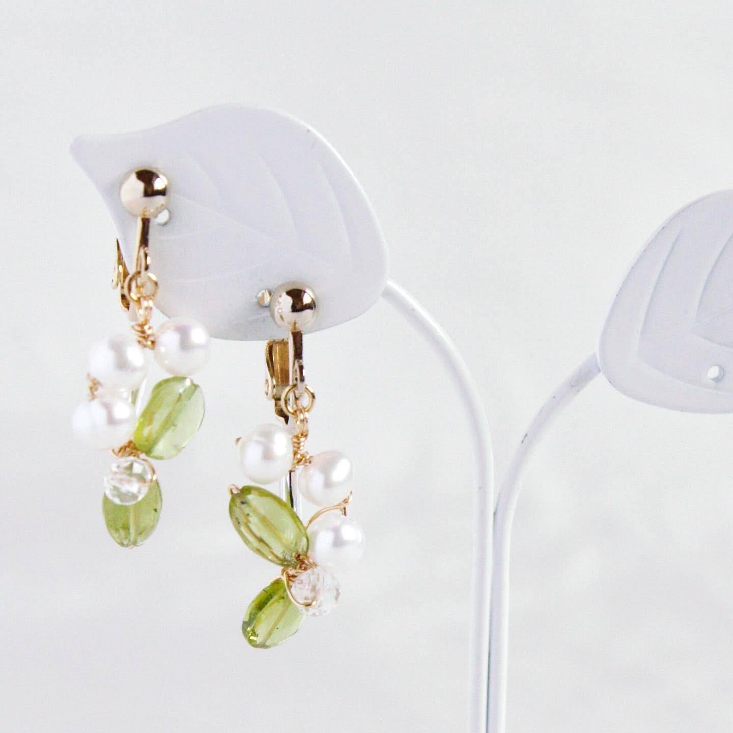 淡水パールですずらんのお花を、ペリドットで葉をイメージして作りました。