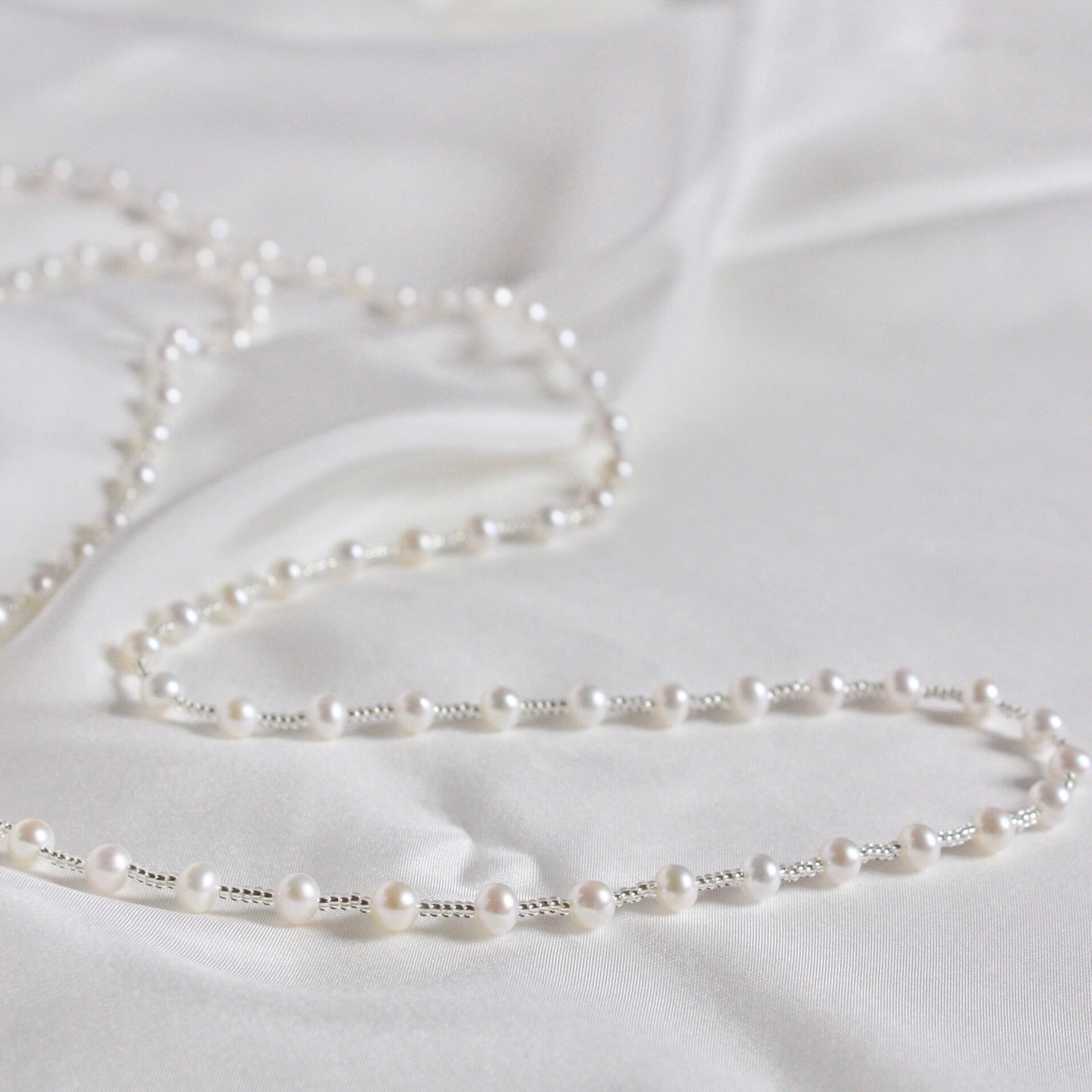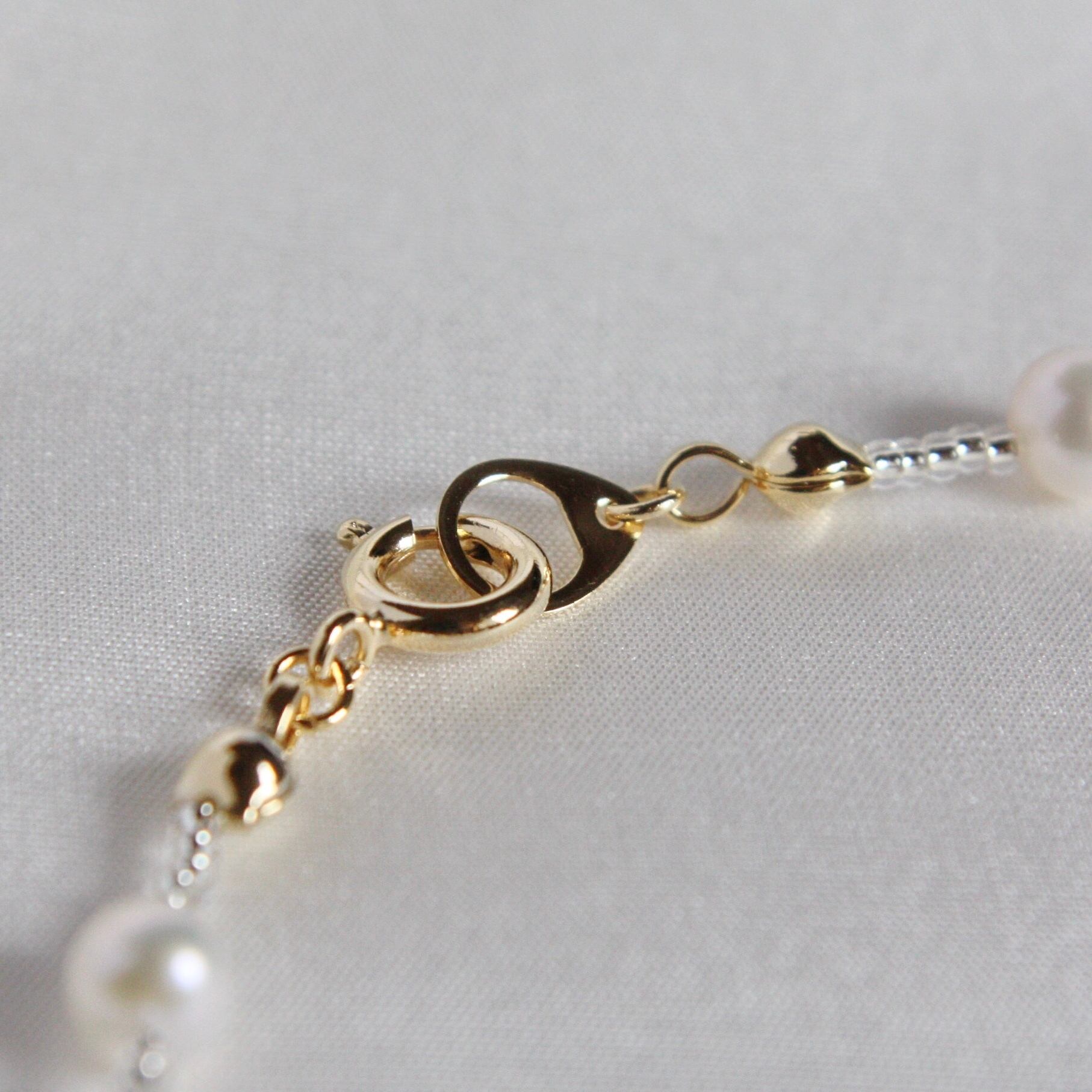 絶妙な間隔でパールが並ぶようにガラスビーズをはさみ、バランスをとりました。