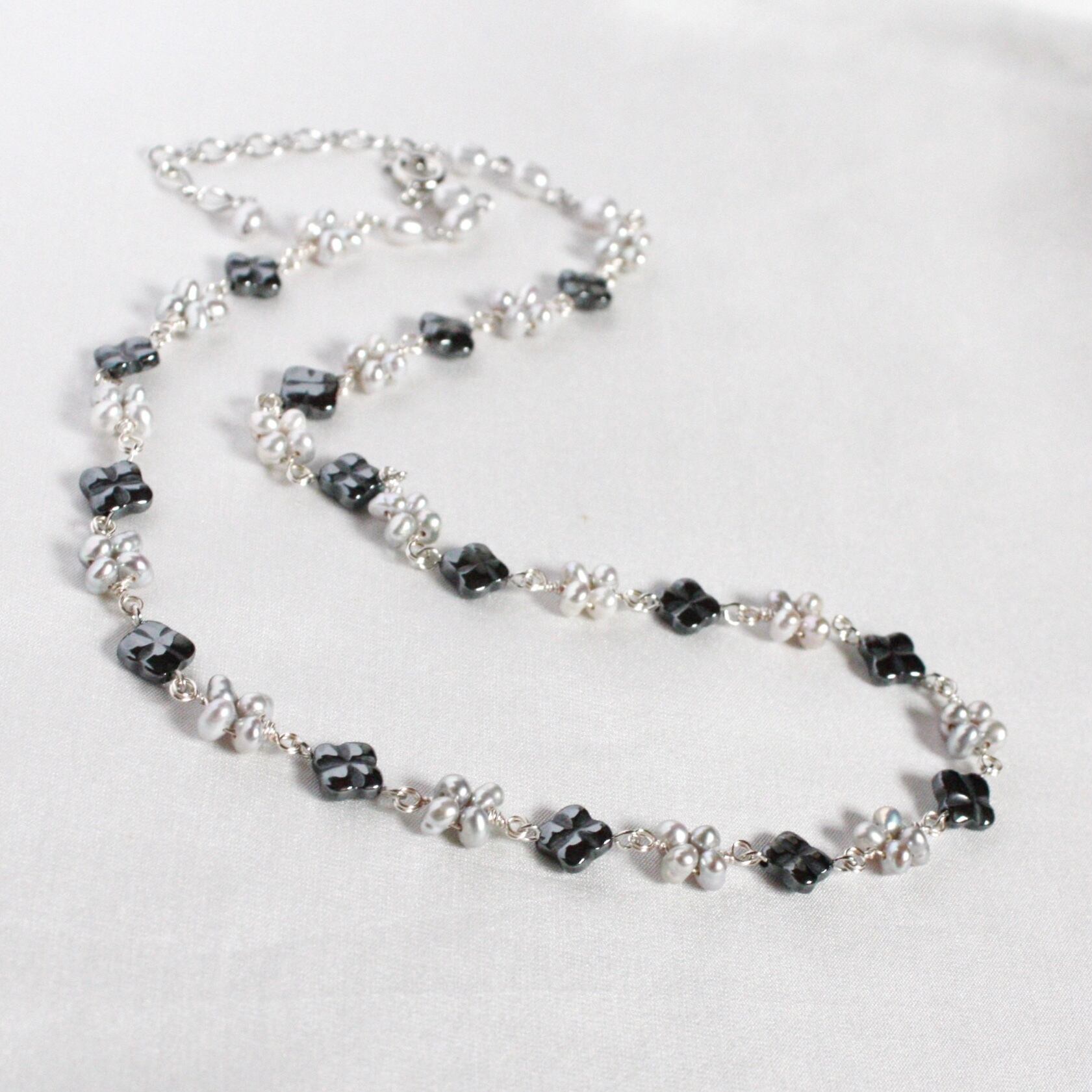 お花の形のガンメタ色のヘマタイトが可愛くてクールなネックレスです。