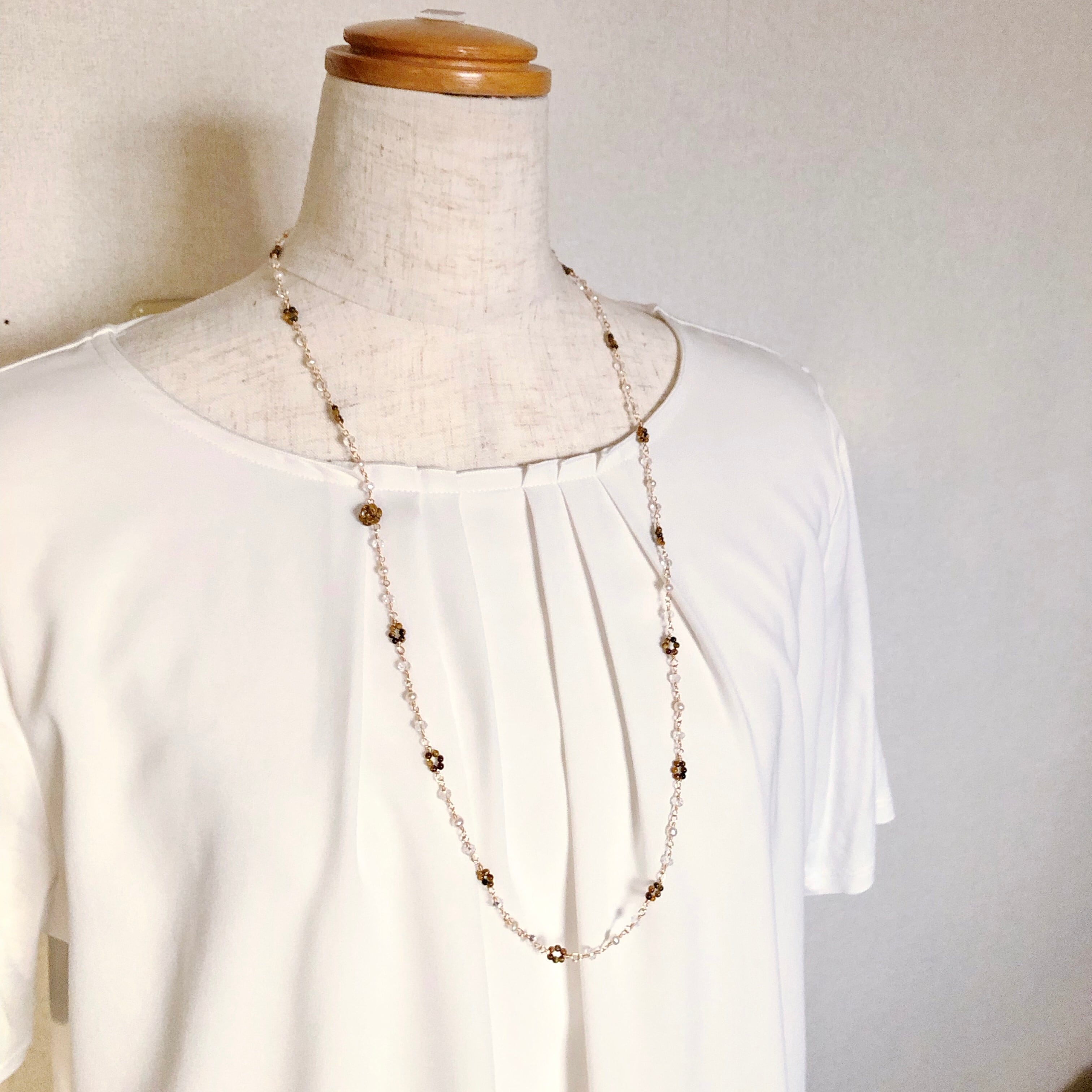 ロッククリスタル(水晶)と淡水パールで繋げたロングネックレスです。