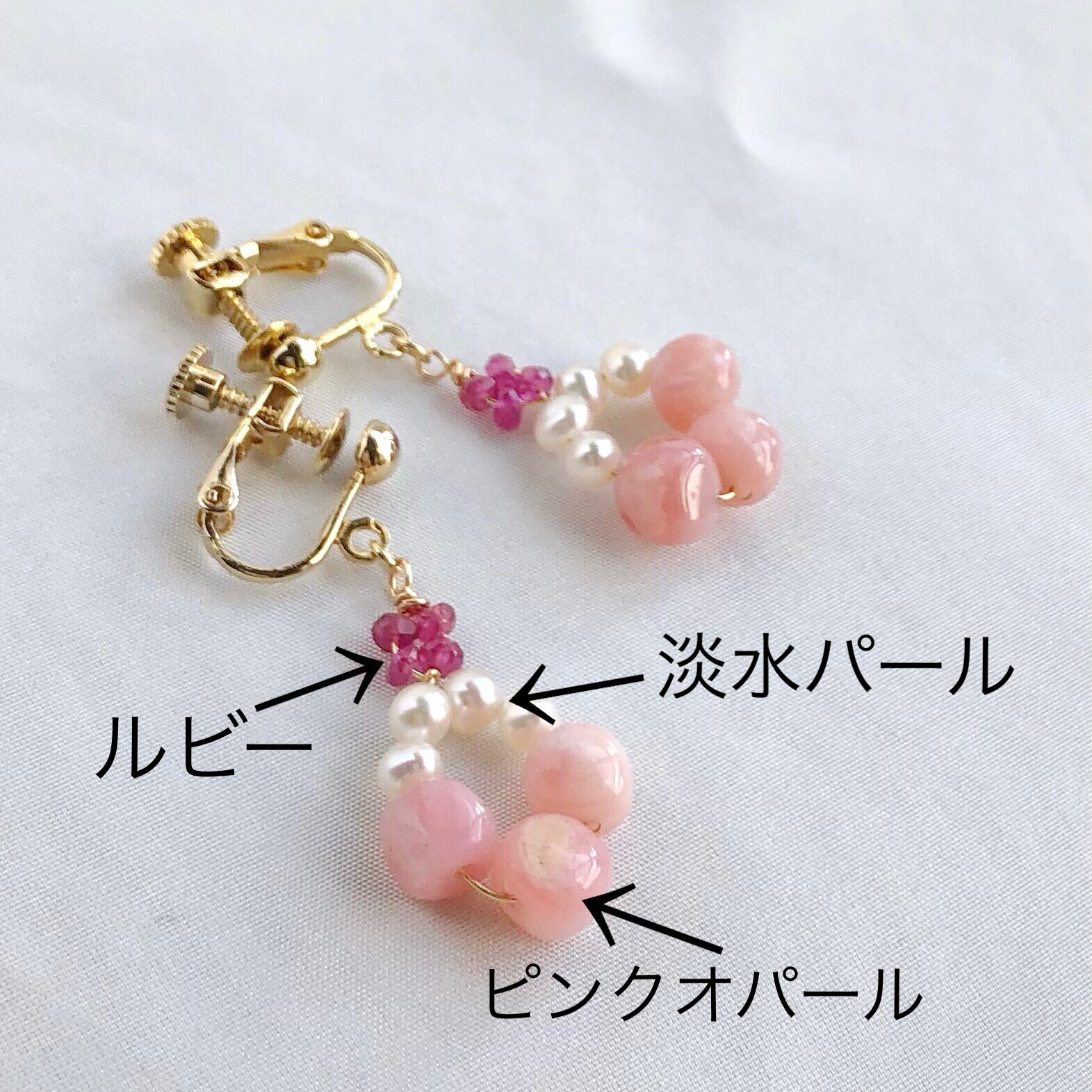 <素材>天然石(ピンクコモンオパール・ルビー・ピンクサファイヤ・淡水パール) 合金