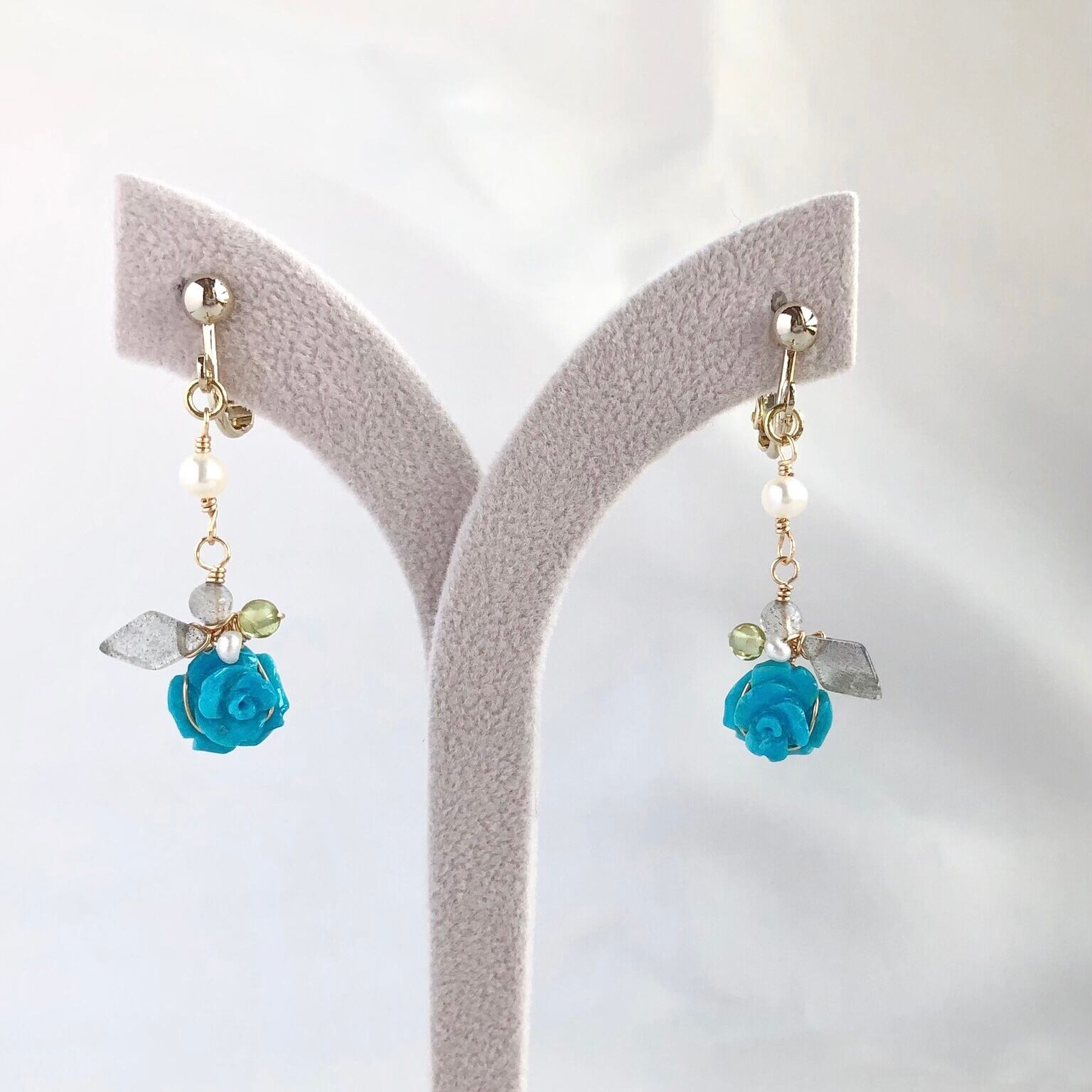青空のように明るく爽やかなターコイズブルーのバラのイヤリングです。